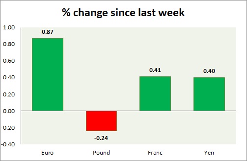 Strength meter (since last week) – Euro +0.87%, Franc +0.41%, Yen +0.40%, GBP -0.24%