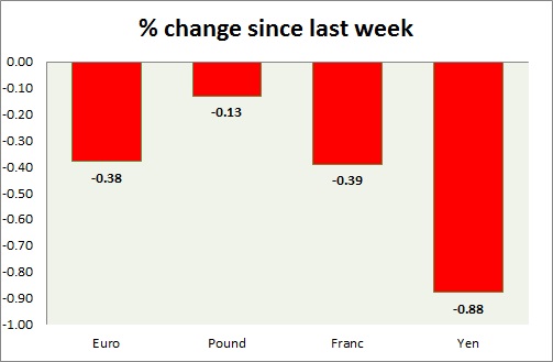 Strength meter (since last week) – Euro -0.38%, Franc -0.39%, Yen -0.88%, GBP -0.13%