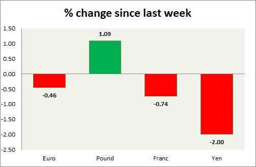 Strength meter (since last week) – Euro -0.46%, Franc -0.74%, Yen -2.00%, GBP +1.09%