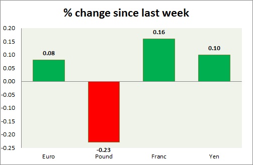 Strength meter (since last week) – Euro +0.08%, Franc +0.16%, Yen +0.10%, GBP -0.23%