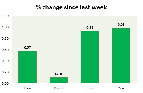 Strength meter (since last week) – Euro +0.57%, Franc +0.93%, Yen +0.98%, GBP +0.10%