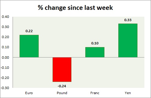 Strength meter (since last week) – Euro +0.22%, Franc +0.10%, Yen +0.33%, GBP -0.24%