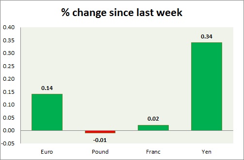 Strength meter (since last week) – Euro +0.14%, Franc +0.02%, Yen +0.34%, GBP -0.01%