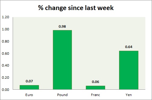 Strength meter (since last week) – Euro +0.07%, Franc +0.06%, Yen +0.64%, GBP +0.98%