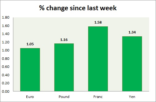 Strength meter (since last week) – Euro +1.05%, Franc +1.58%, Yen 1.34%, GBP +1.16%