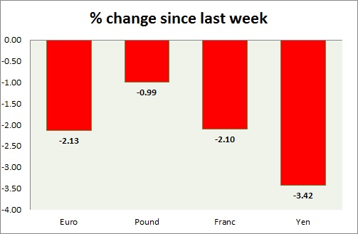 Strength meter (since last week) – Euro -2.13%, Franc -2.10%, Yen -3.42%, GBP -0.99%