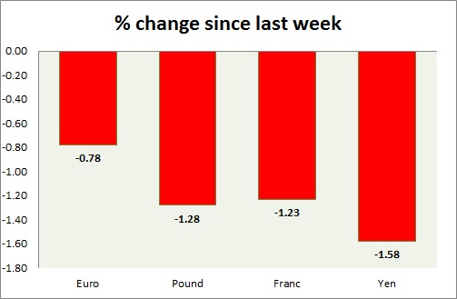 Strength meter (since last week) – Euro -0.78%, Franc -1.23%, Yen -1.58%, GBP -1.28%