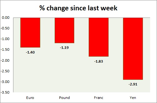 Strength meter (since last week) – Euro -1.40%, Franc -1.83%, Yen -2.91%, GBP -1.19%
