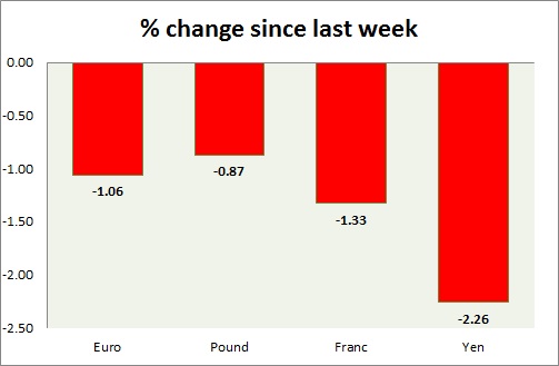 Strength meter (since last week) – Euro -1.06%, Franc -1.33%, Yen -2.26%, GBP -0.87%