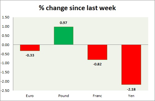 Strength meter (since last week) – Euro -0.33%, Franc -0.82%, Yen -2.18%, GBP +0.97%