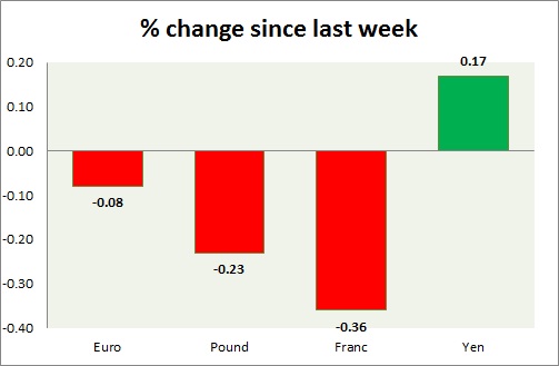 Strength meter (since last week) – Euro -0.08%, Franc -0.36%, Yen +0.17%, GBP -0.23%