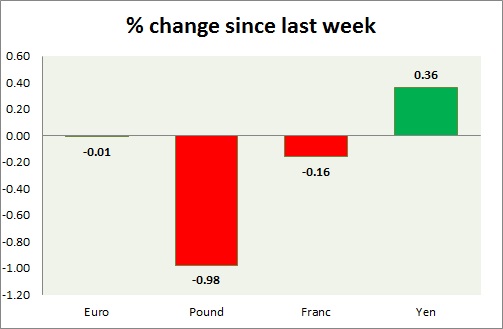 Strength meter (since last week) – Euro -0.01%, Franc -0.16%, Yen +0.36%, GBP -0.98%