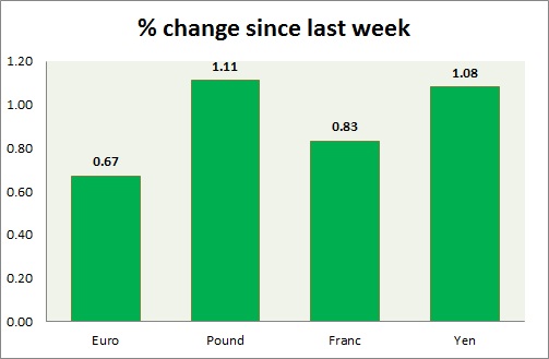 Strength meter (since last week) – Euro +0.67%, Franc +0.83%, Yen +1.08%, GBP +1.11%