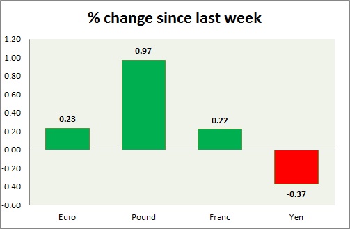Strength meter (since last week) – Euro +0.23%, Franc +0.22%, Yen -0.37%, GBP +0.97%