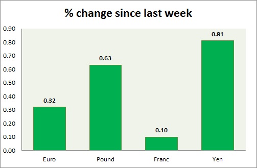 Strength meter (since last week) – Euro +0.32%, Franc +0.10%, Yen +0.81%, GBP +0.63%