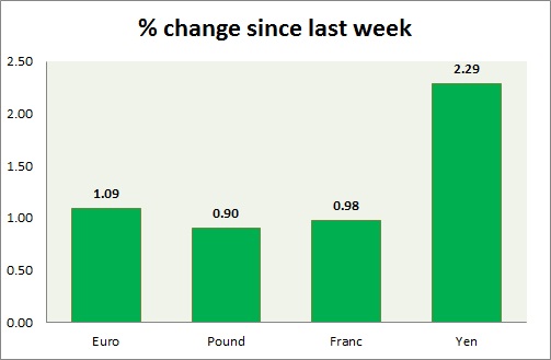 Strength meter (since last week) – Euro +1.09%, Franc +0.98%, Yen +2.29%, GBP +0.90%