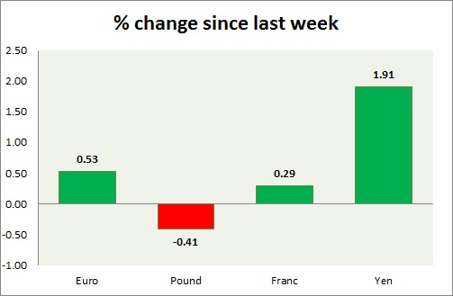 Strength meter (since last week) – Euro +0.53%, Franc +0.29%, Yen +1.91%, GBP -0.41%