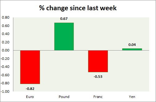 Strength meter (since last week) – Euro -0.82%, Franc -0.53%, Yen +0.04%, GBP +0.67%