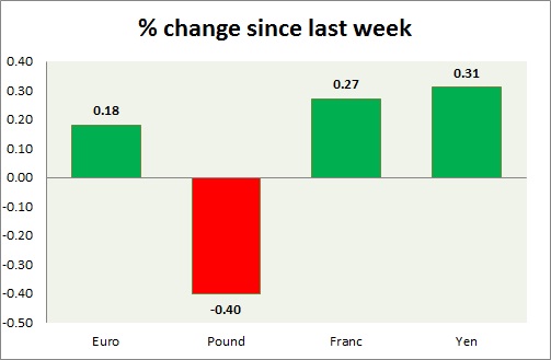 Strength meter (since last week) – Euro +0.18%, Franc +0.27%, Yen +0.31%, GBP -0.40%