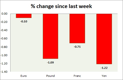 Strength meter (since last week) – Euro -0.10%, Franc -0.71%, Yen -1.22%, GBP -1.09%