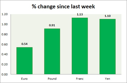 Strength meter (since last week) – Euro +0.54%, Franc +1.13%, Yen +1.10%, GBP +1.46%