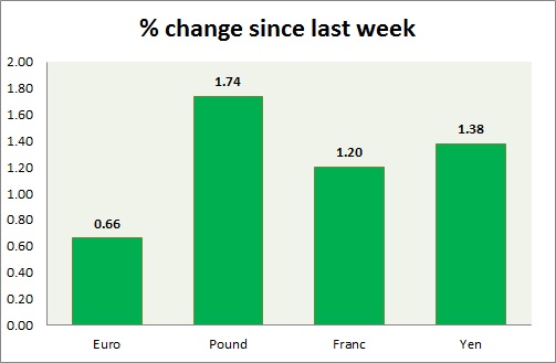 Strength meter (since last week) – Euro +0.66%, Franc +1.20%, Yen +1.38%, GBP +1.74%