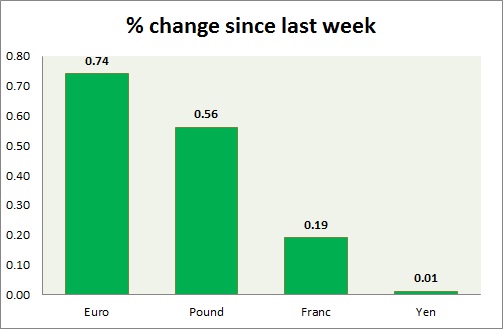 Strength meter (since last week) – Euro +0.74%, Franc +0.19%, Yen +0.01%, GBP +0.56%