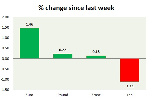 Strength meter (since last week) – Euro +1.46%, Franc +0.13%, Yen -1.11%, GBP +0.22%