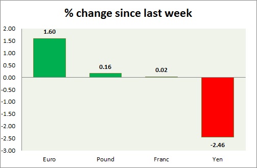 Strength meter (since last week) – Euro +1.60%, Franc +0.02%, Yen -2.46%, GBP +0.16%