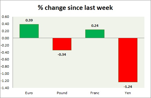 Strength meter (since last week) – Euro +0.39%, Franc +0.24%, Yen -1.24%, GBP -0.34%