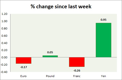 Strength meter (since last week) – Euro -0.17%, Franc -0.26%, Yen +0.95%, GBP +0.05%