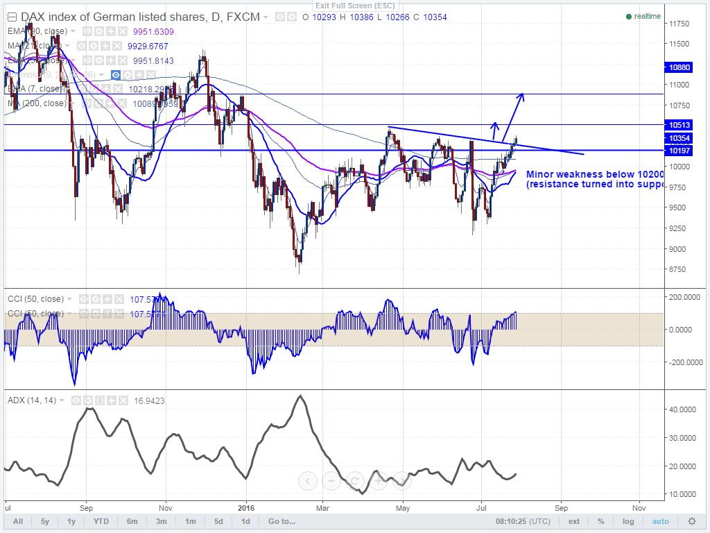 - Short term trend is bullish as long as support 10200 holds. On the higher side major resistance is around 10375 (May 31st high) and any break above targets 10480/10800 in the short term.