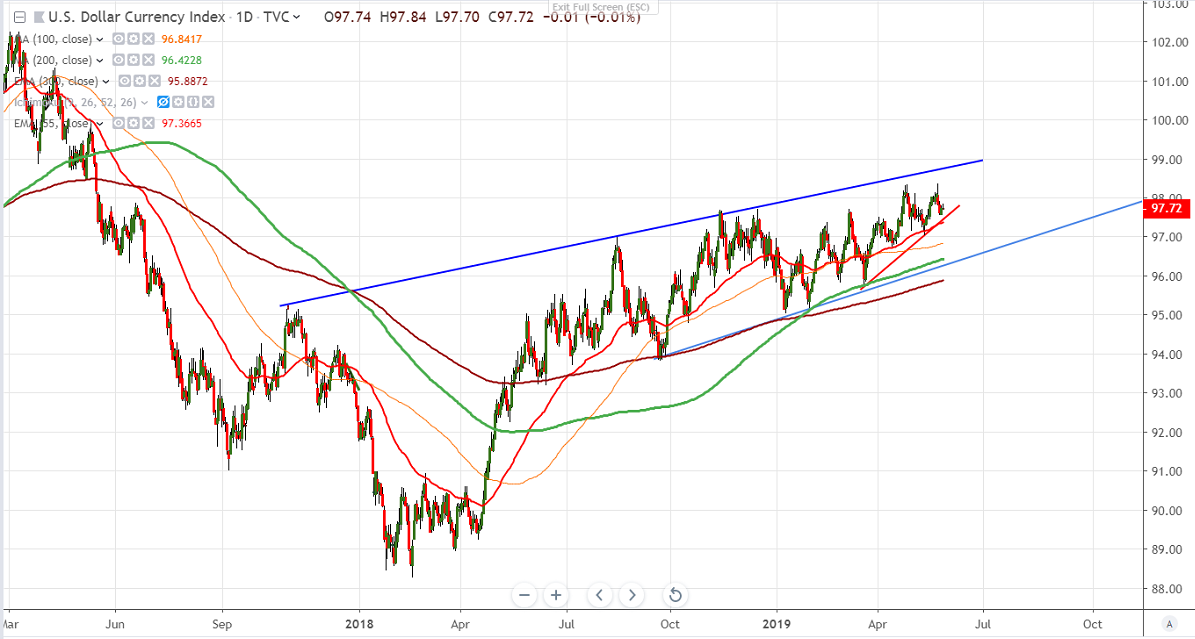 The near term resistance is around 98.40 and any break above will take the index till 98.75 (trend line joining 95.15 and 96.79) /99.26/99.75.
