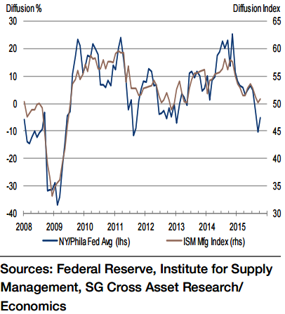 "The net percentage of respondents noting that business was weaker than in September is expected to narrow in both regional surveys. The general business conditions gauge in the Empire State Manufacturing Survey likely improved by 7.2 percentage points to -7.5%, while the contractionary reading in the Philadelphia Outlook Survey was halved to -3.0%", says Societe Generale.