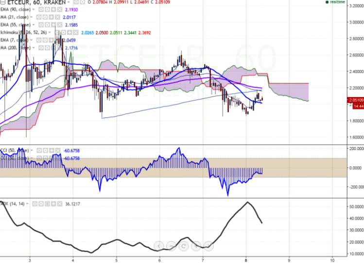 ETC/EUR jumped slightly above 200 HMA and declined from that level (KRAKEN). It is currently trading around 2.0461 at the time of writing.