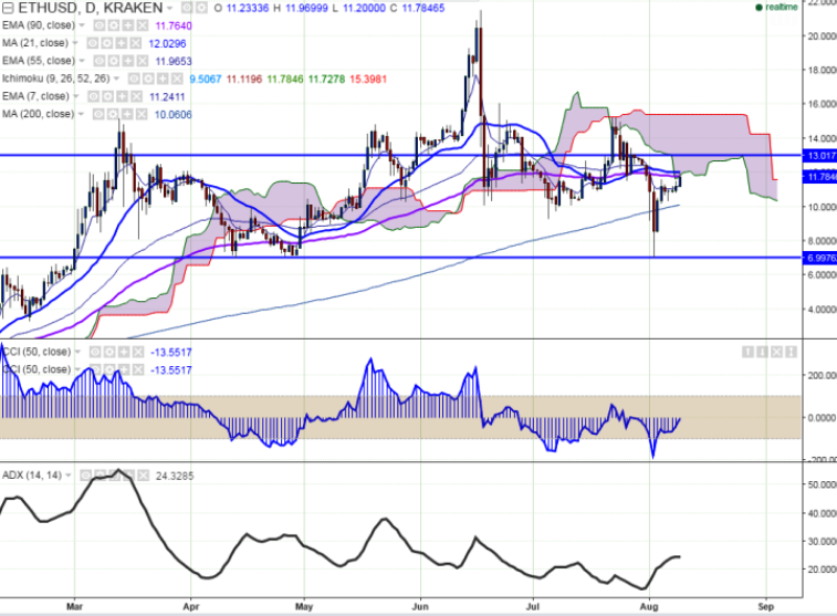 ETH/USD is gradually picking up momentum and has hit 11.96 levels so far in the day. It is trading at 11.82 levels at the time of writing (Kraken).