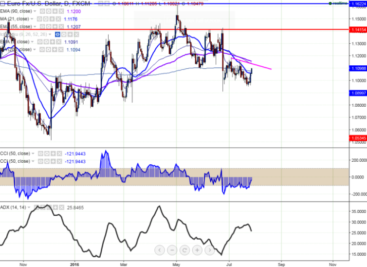 - Any violation below 1.1050 will take the pair to next level till 1.11375 (trend line joining 1.11861 and 1.11648)/1.11860 (Jul 5th 2016 high).