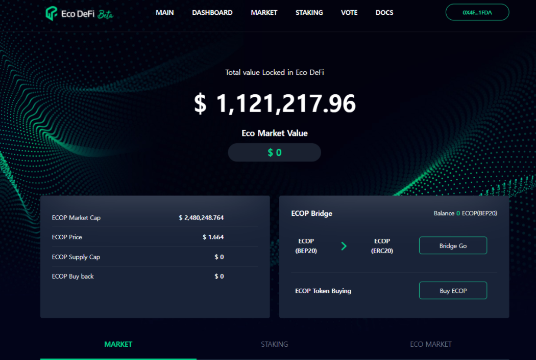 The beta version of Eco DeFi built on the Binance Chain released today comprises the general lending DeFi market, Eco Market that one can invest into the renewable energy industry, and the NFT market. Especially the eco-market, where investors can invest in the renewable energy industry in the carbon-neutral era, is clearly differentiated from the existing DeFi platform, making Eco DeFi unique.