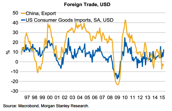 The figure above shows upcoming Chinese data releases are likely to come in on the strong side based on the relationship between US consumer goods imports and China's total export growth. Rising US imports could inspire currently stagnating global trade.