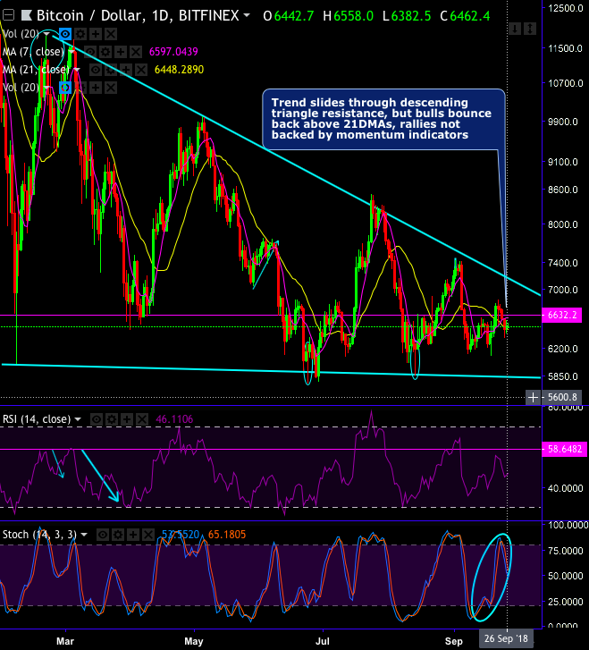Bitcoin continued its last weekend’s bearish sentiments, it has currently been, trading at $6,618.6 levels while articulating, BTCUSDtrend slides through descending triangle resistance, although bulls bounce back above 21DMAs, but the rallies are not backed by momentum indicators (refer daily chart).