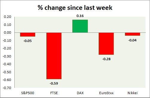 Equities are all red today. Kindly note all instruments mentioned here are CFDs, whose values might differ from cash or future traded. Performance this week at a glance in chart & table -