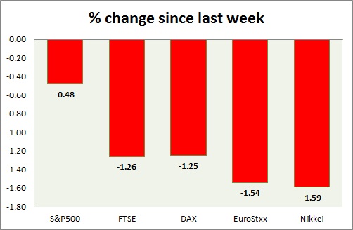 Equities are all trading in red today. Kindly note all instruments mentioned here are CFDs, whose values might differ from cash or future traded. Performance this week at a glance in chart & table -