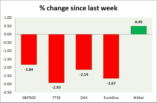 Equities are all red in today's trading. Kindly note all instruments mentioned here are CFDs, whose values might differ from cash or future traded. Performance this week at a glance in chart & table -