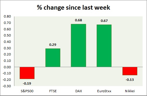 Equities are all red in today's trading. Kindly note all instruments mentioned here are CFDs, whose values might differ from cash or future traded. Performance this week at a glance in chart & table -