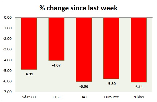 Equities are all red in today's trading. Kindly note all instruments mentioned here are CFDs, whose values might differ from cash or future traded. Performance this week at a glance in chart & table -