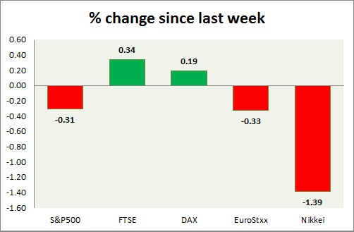 Equities are all green in today's trading. Kindly note all instruments mentioned here are CFDs, whose values might differ from cash or future traded. Performance this week at a glance in chart & table -