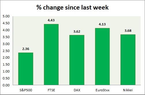 Equities are all green in today's trading. Kindly note all instruments mentioned here are CFDs, whose values might differ from cash or future traded. Performance this week at a glance in chart & table -