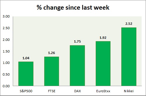Equities are all green in today's trading. Kindly note all instruments mentioned here are CFDs, whose values might differ from cash or future traded. Performance this week at a glance in chart & table -