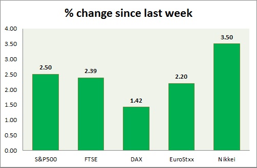 - German DAX is up (+1.1%), France's CAC40 is up (+1.1%), Italy's FTSE MIB is up (+1.8%), Spain's IBEX is up (+1.5%).
