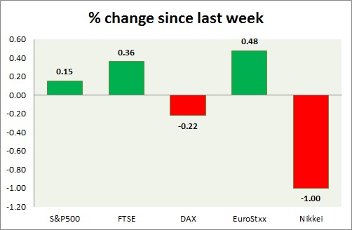 Equities are all mixed in today's trading. Kindly note all instruments mentioned here are CFDs, whose values might differ from cash or future traded. Performance this week at a glance in chart & table -